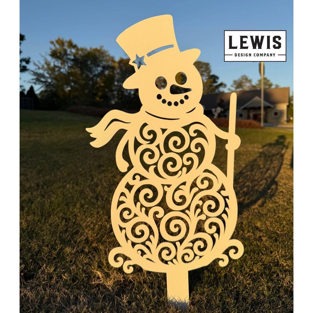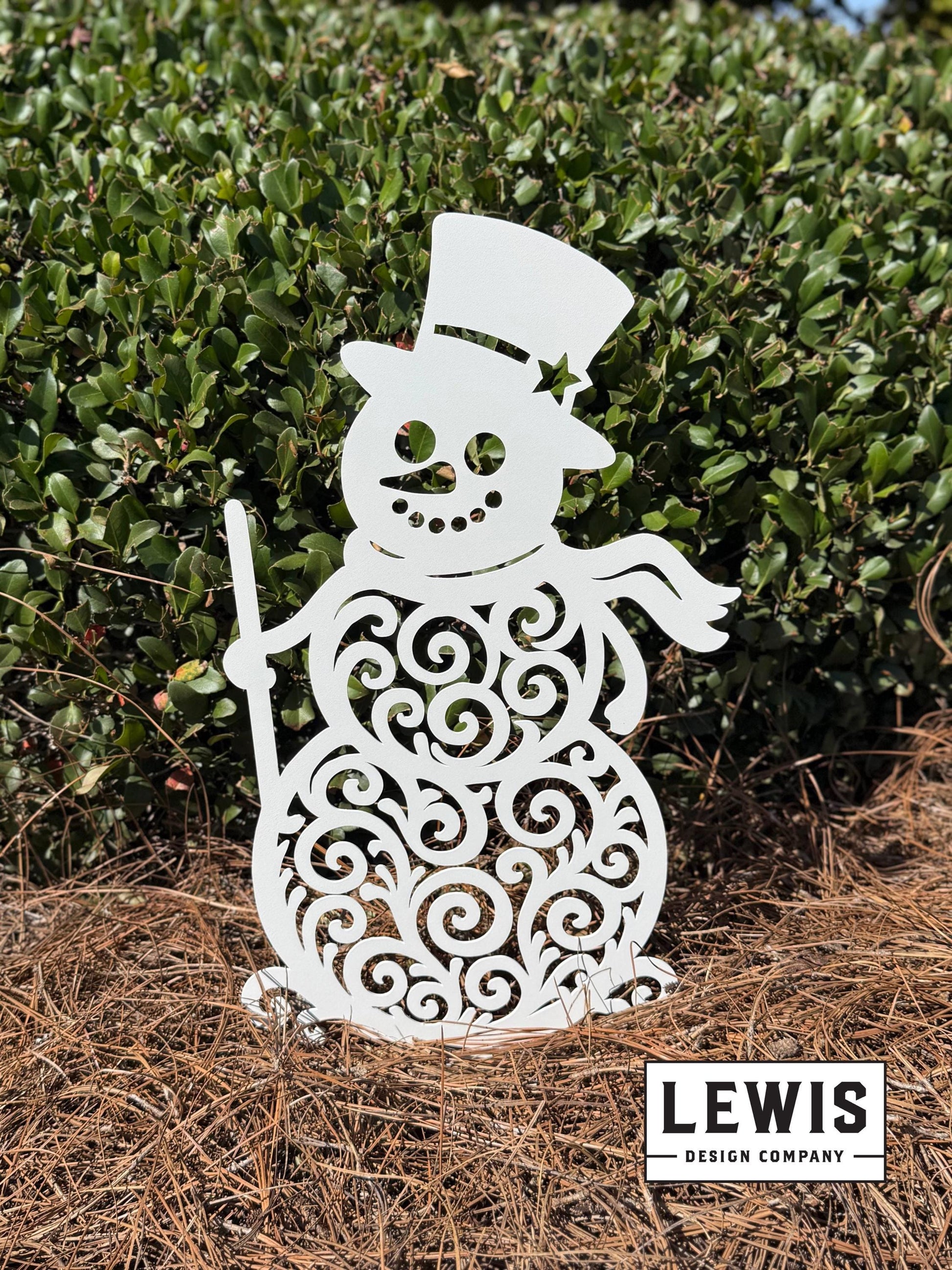 Add festive charm to your yard this winter with our decorative metal snowman! Each snowman is CNC-cut from durable steel and powder-coated for a long-lasting, weather-resistant finish. The whimsical swirl design makes this Frosty stand out day or night — a perfect way to welcome the holiday season.